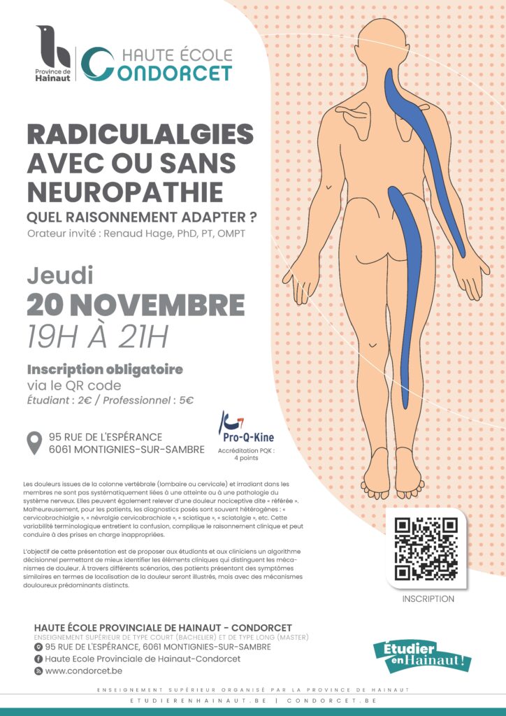 Les douleurs irradiant de la colonne vers les membres ne sont pas toujours d’origine neurologique. Cervicobrachialgie, sciatique, sciatalgie… Ces termes variĂ©s crĂ©ent souvent la confusion. Cette confĂ©rence vous propose un algorithme dĂ©cisionnel pour mieux identifier les mĂ©canismes de douleur.